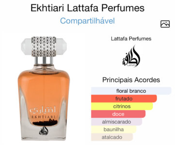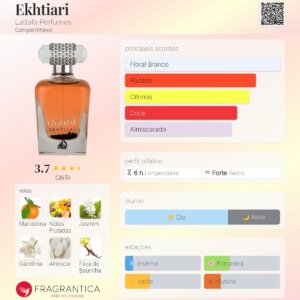 Ekhtiari de Lattafa Perfumes é um perfume Aromático Frutado Compartilhável. Ekhtiari foi lançada em 2019. As notas de topo são: Mandarina e Frutas. As notas de coração são: Jasmim e Gardênia. As notas de fundo são: Almíscar, Baunilha e Fava Tonka.