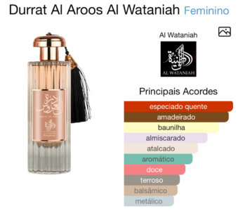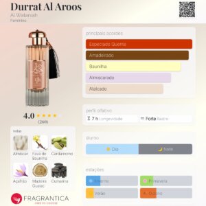 Durrat Al Aroos de Al Wataniah é um perfume Âmbar Feminino. Esta é uma nova fragrância. Durrat Al Aroos foi lançada em 2022. As notas de topo são: Almíscar Branco e Nagarmota ou Óleo de Cipriol. As notas de coração são: Baunilha, Açafrão e Cardamomo. As notas de fundo são: Madeira Guaiac e Cumarina.