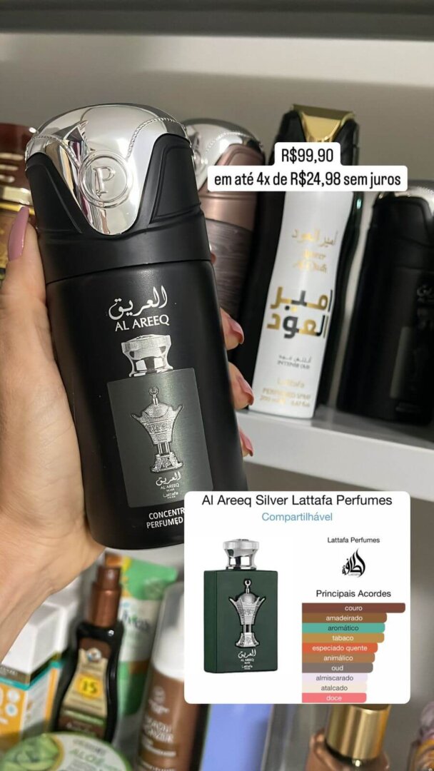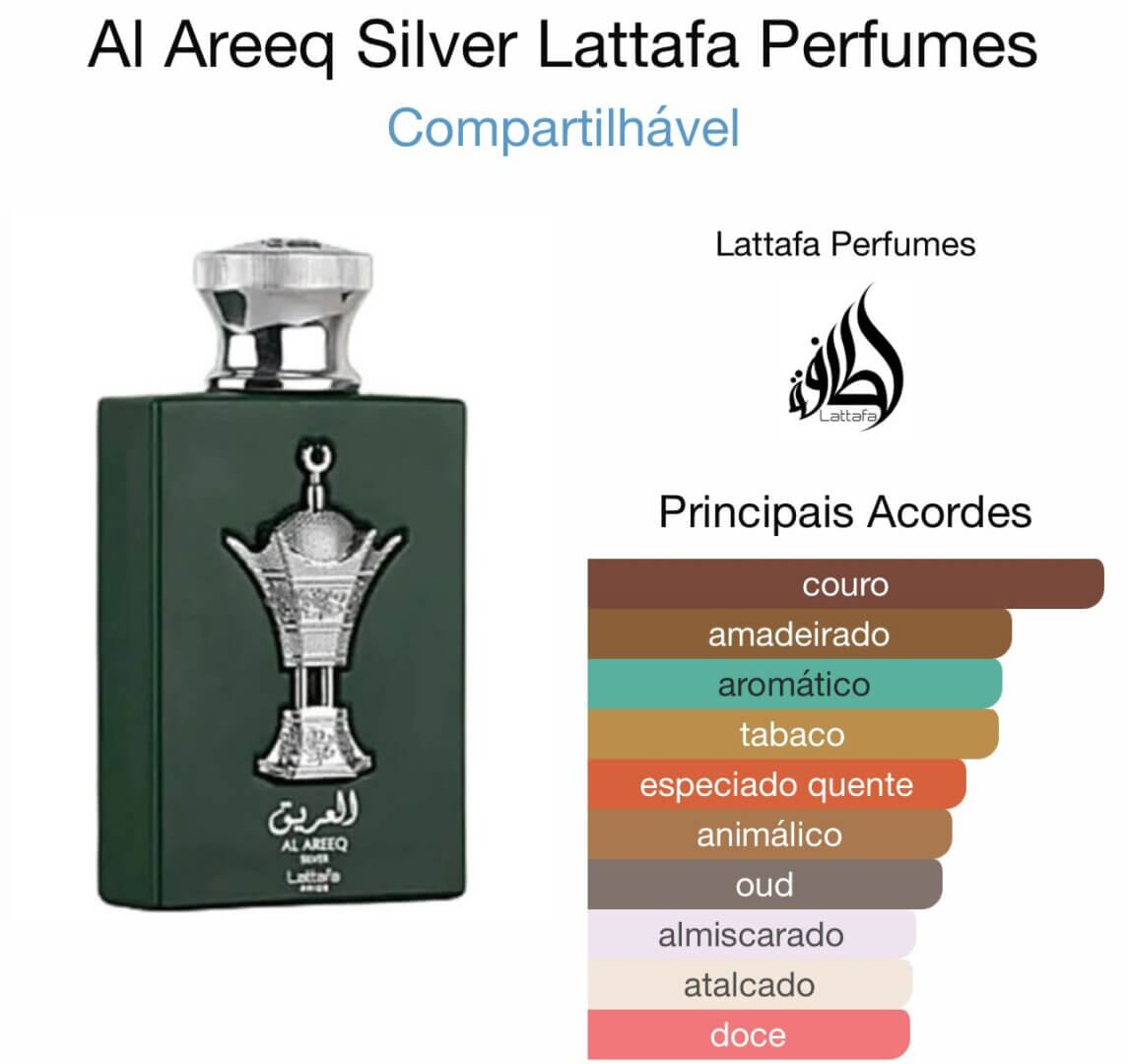Al Areeq Silver de Lattafa Perfumes é um perfume Compartilhável. Esta é uma nova fragrância. Al Areeq Silver foi lançada em 2022. As notas de topo são: Cardamomo, Lavanda e Maçã. As notas de coração são: Tabaco, Cipreste, Agarwood (Oud) e Jasmim. As notas de fundo são: Couro, Almíscar, Sândalo e Baunilha.