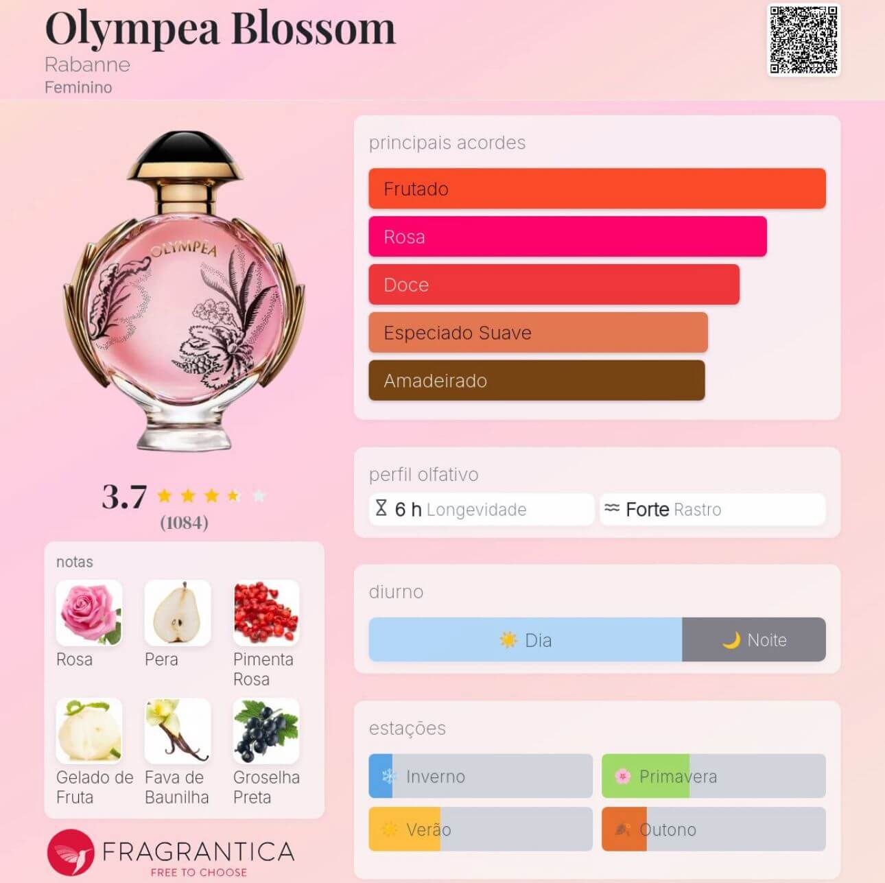 O perfume Olympéa Flora, de Paco Rabanne, proporciona uma explosão de rosas frescas e peônias. A fragrância possui um delicioso acorde de sorbet de groselha envolvido em baunilha suave e salgada, a famosa assinatura de Olympéa. Um rastro de madeira de caxemira almíscar para adicionar um toque de elegância e mistério. Uma orquídea preta e folhas tropicais condizem com a assinatura deliciosa de baunilha da fragrância. O toque do buquê rosa combina com os espinhos da rosa e as pétalas frescas da peônia, expressando duas facetas divinas de feminilidade.